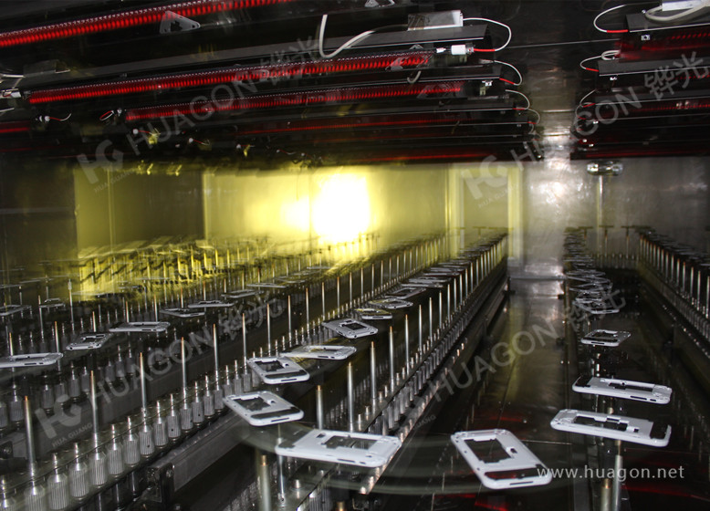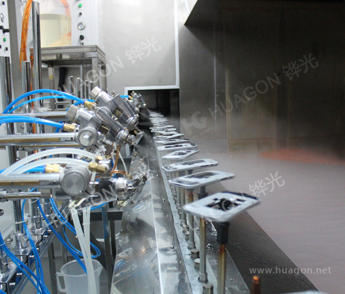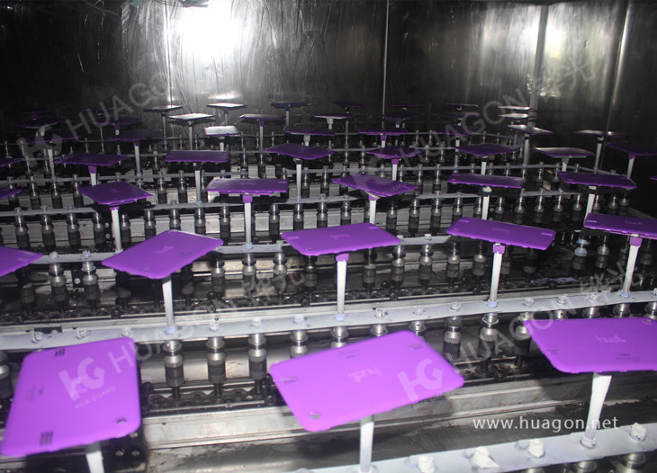 上料-手動靜電除塵-素材預(yù)熱-自動靜電除塵-自動底漆噴涂-表干-自動面漆噴涂-靜置-烘烤-冷卻-下料
